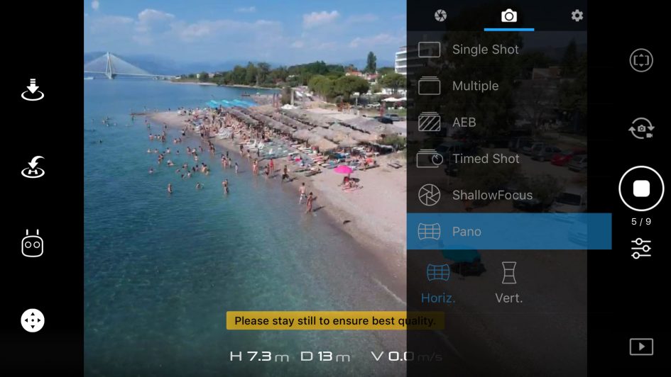 On the right you find the camera/video shutter button, flanked above and below by buttons for still or video mode and for camera settings, and on the left with a control for the gimbal’s vertical tilt. On physical controllers, including the optional RC, this is a control usually handled by a finger-wheel on the left shoulder of the remote, and on-screen is definitely a weaker solution, though still more natural to me, at least, than the tolerable option to use the phone’s gyro to ‘tilt’ the camera.