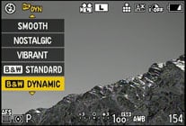 Contrast, Sharpness, Saturation and Noise Reduction are applied using the GF1’s various Film Modes, each adjustable by two steps up or down and accessed via the Q.Menu or main menu system. The GF1 offers nine Film Mode presets (six in colour and three in black and white, although sadly saturation isn’t replaced by any filters in the latter), along with two Custom modes and a Multi Film option which brackets by using your choice of three Film Modes.