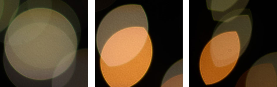 This test is for the rendering of point-light sources in an out-of-focus background. The circle of confusion that is produced by this test is pretty indicative of Bokeh performance (in the background) and light fall-off. Ideally the out-of-focus image of the point-light is evenly lit and perfectly circular, with no “onion-rings”, and without coloration. Large aperture lenses normally produce an effect known as “cat’s eye” the further away from the optical axis the point-light is projected. This is due to optical vignetting in the lens barrel when light enters the lens from an angle.