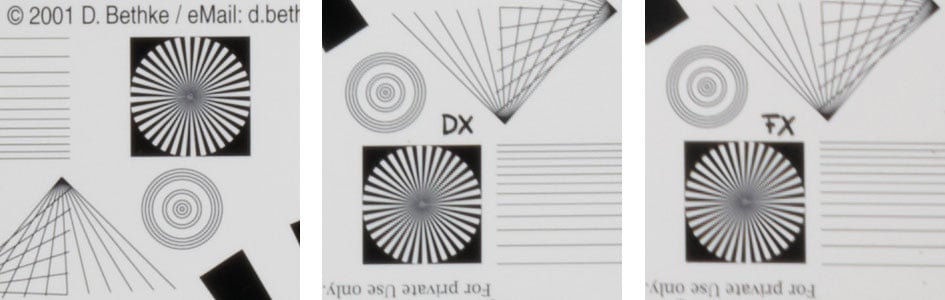Above: Tamron 24-70mm f2.8 VC G2 at 50mm, f4.0; 100% crop from center, APS-C/DX-corner, FX-corner