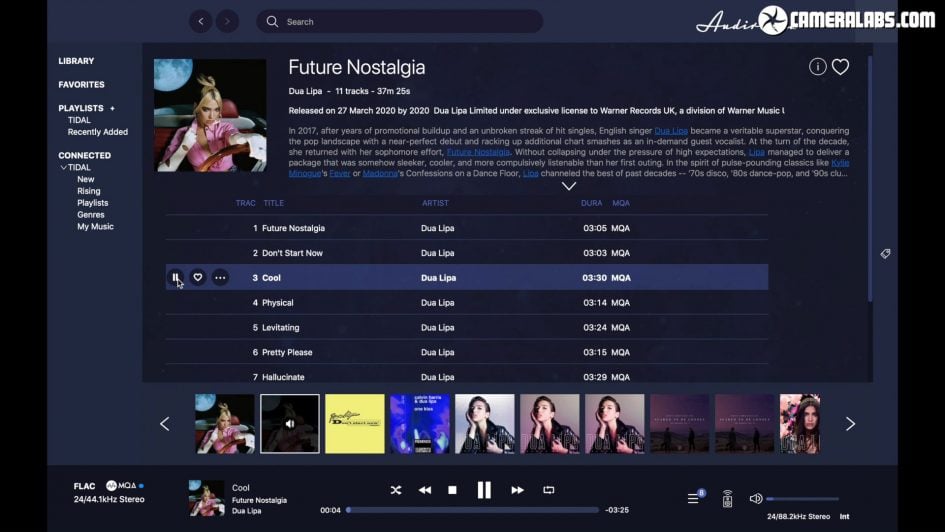 I love being able to browse and choose music from my laptop then hear it emerge from my main hifi system in HD quality without any direct cabling between them. Here’s Audivarna playing Michael Kiwanuka’s self-titled album, followed by Dua Lipa’s Future Nostalgia, both available as Tidal masters, although notice how Kiwanuka is in 24 bit 96KHz, while Future Nostalgia is in 24 bit 44.1KHz.