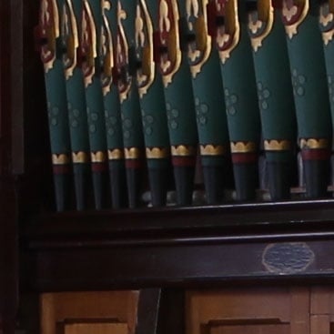The Nikon tops-out at 6400 ISO, where it’s become quite noisy and suffered from a clear drop in saturation. The Canon also suffers from significant noise at this point, and both cameras have virtually lost the flower engravings on the organ pipes. But in its favour the EOS 550D / T2i has at least maintained colour saturation (or at least compensated for it).