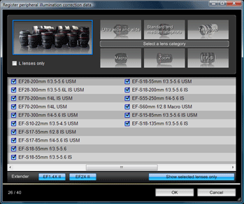 Any lens for which DPP offers corrections can be entered into the 7D’s internal database using the supplied EOS Utility. The latest version includes correction data for the new EF-S 15-85mm and EF-S 18-135mm IS zooms. DPP also offers data for each lens fitted with a 1.4x or 2x Extender, although these will count as additional entries in the 7D’s 40-model internal database.