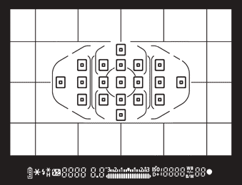All 19 points are cross-types, sensitive to both horizontal and vertical lines when used with lenses of f5.6 or brighter. The central point also features a separate diagonal pair of line sensors which are automatically used with lenses sporting an aperture of f2.8 or faster.