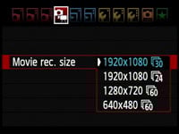 The EOS 7D allows you to film at 1920×1080, 1280×720 or 640×480 pixels. The Full HD 1920×1080 mode can be set to record at either 30fps (29.97 actual) or 24fps when the Video System is set to NTSC, and 25 or 24fps when set to PAL. The 1280×720 and 640×480 modes record at a higher frame rate of either 60fps (59.94 actual) when set to NTSC or 50fps when set to PAL. The screen-grabs here show the quality page when the video system is set to NTSC or PAL.