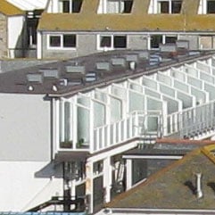 Moving on to the full-size crops, it’s really very difficult to find fault. This lens and sensor combination delivers very good results in all areas of the frame. Edge detail is well resolved – note the crosses on the chapel roof, the lighthouse and foreground houses in the second crop, the detail in the chimney cowling and the roof behind it in the third crop and the balcony area in the final crop taken from a central part of the frame. They are all very clear, very sharp and very punchy.