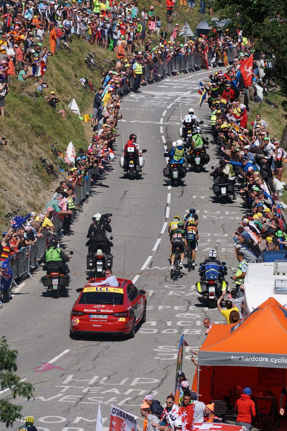 Once you’re on Alp d’Huez, you can walk down the final few km of the course to find a good viewing location. There were plenty of good spots along the road in 2015 even as late as 1pm, but like the final section of all stages, there were barriers preventing you from getting too close. Since I’d already got up close and personal on the previous stages, I decided to go for the spectacle at Alp d’Huez and view the switchbacks from the side of one of the overlooking hills. To access this hill, you should avoid the town and route itself and take a back road to the right side as you exit the second cable car from Oz en Oisans; a short hike along a road and down a ski run and you’ll enjoy expansive views of the winding road and mountains beyond. There’ll be loads of people there, but you’ll easily find plenty of room to sit and enjoy the event as it unfolds.