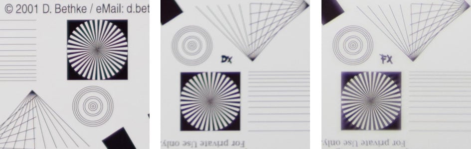 What follows are near-center results (first column) followed by DX-corner results and FX-corner results on a D810. The D810 results from the DX-corner should be a very good approximation for performance on a 16MP DX sensor (like the D7000), because the pixel-pitch of both sensors are the same. But differences in the AA-filter and micro-lens-design of a D810 and a D7000 might yield different end-results.