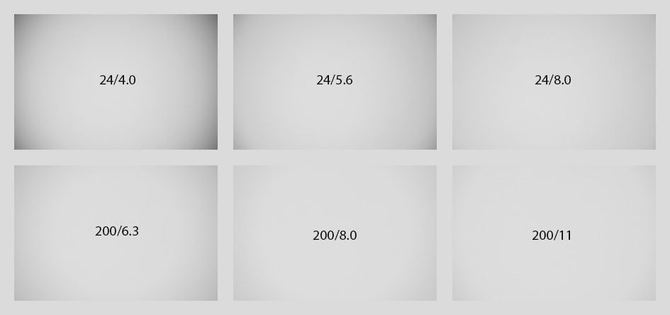 To make it easier to see light fall-off in the corners of a full-frame sensor I’ve arranged a series of three shots each with the new Z-Nikkor from f4.0 to f8.0 at 24mm and f5.6-f11 at 200mm focal length. All images were developed to the same brightness in the center and with the built-in lens profile compensating vignetting set to “normal”: