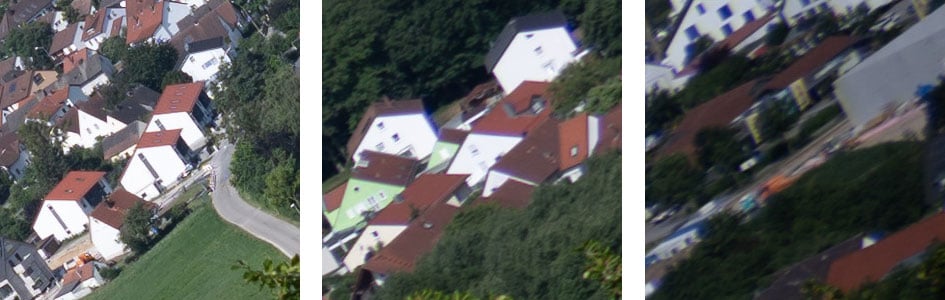 The Siemens-star test-targets are shot at a distance of 45x focal length (i.e. at around 3m for 70mm focal length). But performance of lenses also depends on the shooting distance. Therefore I present another series of test-shots of a city around 1 km away. Processing was done in Lightroom 9.2/CRAW 12.2 from RAW to Adobe Color profile with the built-in lens profile compensating CA and vignetting. Noise-reduction is set to 0, sharpening to 50/0.5/36/10, with no extra tone, color, or saturation adjustment. I used manual focus at the largest aperture and did not change focus for other apertures. All shots were made at ISO 100 and image stabilization switched off.