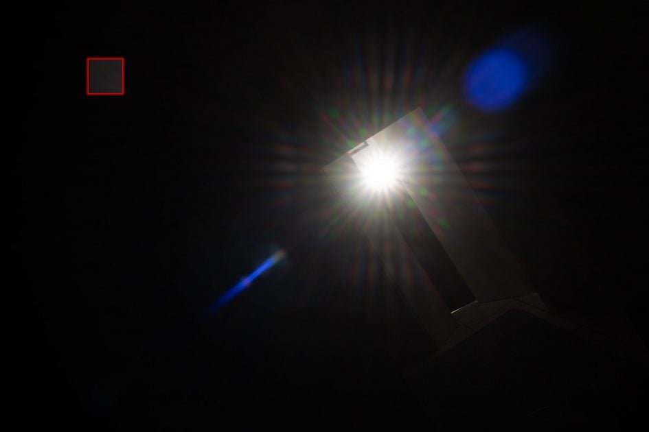 Catching a strong light-source shining directly into the lens is always a risky business: it could produce strange colorful ghost-images or reduce contrast considerably through flare and glare. The appearance of flare and ghosting depends on factors like the aperture and the angle of the light hitting the lens. So to judge the proclivity of Nikon’s Z 40mm f2.0 for these artifacts I went through a series of well calculated shots against a strong light-source to provoke glare and ghosting. Following are two of the more extreme example results. The little bright square inset in the upper left shows the respective area with an exposure compensation of +3 EV to make it easier to see which levels of black the lens renders at that point: