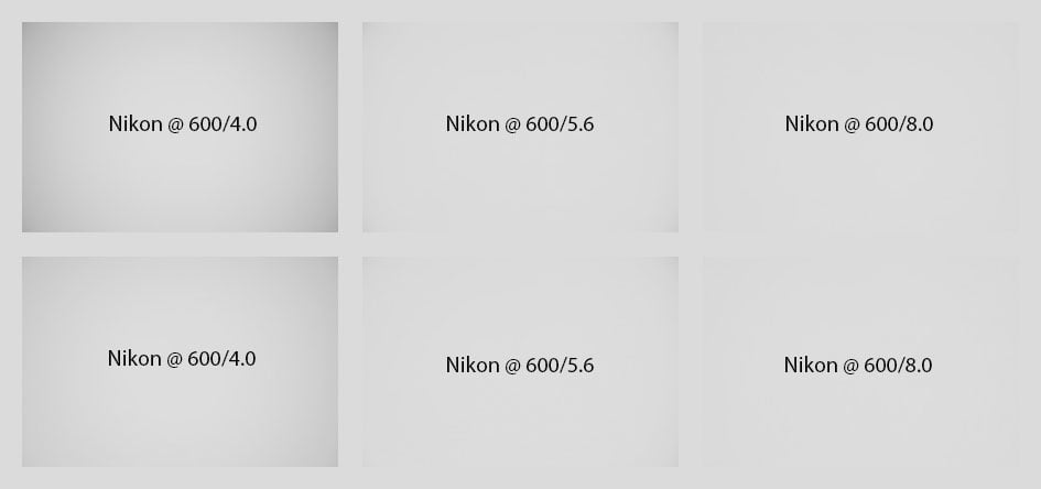 To make it easier to see light fall-off in the corners of a full-frame sensor I’ve arranged a series of three shots each with the Nikon Z 600mm f4 TC VR S both with and without the built-in teleconverter. All images were shot as JPGs on a Nikon Z7 with picture control set to Standard and developed to the same brightness in the center. They are shown with vignette control Off (1st row) resp. Normal (2nd row).
