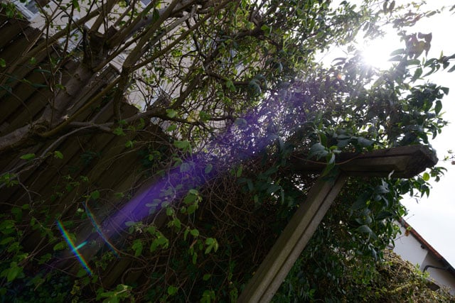 The image shows what happens if you’re shooting with the sun in your frame. This is one of the worst flares that I could produce with this lens. Of 25 shots under similar conditions only three showed comparable flare and some ghosting and 10 others showed weaker flare and less pronounced ghosts. So in about half of the shots produced under these adverse conditions flare or ghosting came up which is quite often. But there’s some consolation: there’s no veiling glare in these images and the blacks are really black.