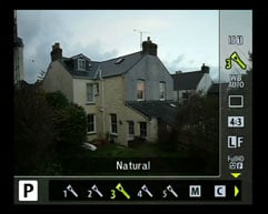 Shooting modes on the E-PM1 are accessed via the menu screen. In iAuto mode the Live Guide screen provides access to saturation, white balance and exposure controls presented in a non-technical way with slider controls. So changing white balance, or widening the aperture to limit depth of field simply involves rotating the control dial to move a slider between ‘flat and muted’ and ‘clear and vivid’, or ‘blur and sharp’.