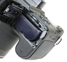 Like its predecessor, a door on the left side of the FZ28’s body opens to reveal DC-in and a combined USB / video out port. New to the FZ28 is a second door on the right side of the body which houses its Component video port. When used with the optional DMW-HDC2 cable, this allows the FZ28 to deliver HD slideshows to an HDTV in the 1080i format – an upgrade from the FZ18 and an advantage over the Canon SX10 IS which both only offer standard definition composite video outputs.