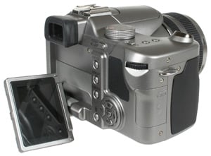The main display itself is a flip-out and twist design, with the hinge at the bottom of the camera. While this allows a more sensible waist-level shooting configuration without the screen poking out to one side, it does mean the screen can in some instances fold out below the body. Panasonic’s made a small improvement to the hinge over the FZ30 though, with the FZ50’s screen now able to swing around to face you in self-portraits; this is of limited use in practice though as the screen’s position when flipped-down prevents tripod mounting, and the live image (on our sample anyway) was upside-down when twisted to face out. You can see a demonstration of the flip-out screen in our video tour.
