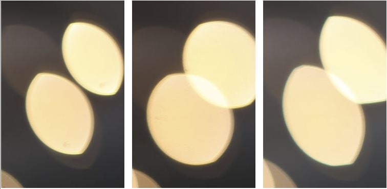 This test is for the rendering of point-light sources in an out-of-focus background. The circle of confusion that is produced by this test is pretty indicative of Bokeh performance (in the background) and light fall-off. Ideally the out-of-focus image of the point-light is evenly lit and perfectly circular, with no “onion-rings”, and without coloration. Large aperture lenses normally produce an effect known as “cat’s eye” the further away from the optical axis the point-light is projected. This is due to optical vignetting in the lens barrel when light enters the lens from an angle.