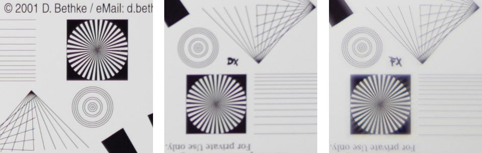 Above: Sigma 24mm f1.4 Art on a 36MP Nikon D810 at f2.0; 100% crop from center, APS-C-corner, FF-corner