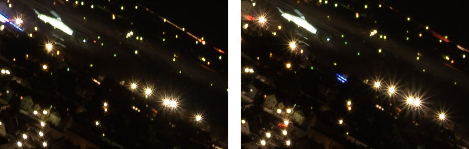 Above: Sunstars from the Sony FE 35mm f2.8 ZA at f5.6 (left) and f8.0 (right), 100% crops