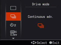 The Sony Alpha A200 offers one Continuous Shooting mode rated at 3fps; Sony quotes a maximum buffer of three frames in RAW+JPEG mode, six in plain RAW mode, and no limit for recording JPEGs.
