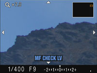 Press this and the mirror flips-up and the shutter opens to reveal a live image generated by the main sensor itself. Unlike the main Live View system, this delivers 100% coverage, an optional alignment grid, and crucially, the option to magnify the view by 7 or 14 times to confirm the absolute focusing.