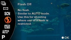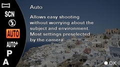Auto delivers a fairly basic automatic exposure mode without, as far as we can tell, any scene detection; Flash Off is the same, but forces the popup flash not to fire.