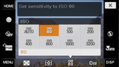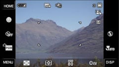 Tapping the DISP icon in the lower right corner allows you to reduce the number of on-screen details and icons for a cleaner view, albeit one without many means of adjustment. The DISP menu also offers a Live Histogram, and if you delve into the menu system and you’ll also find an option to enable a three-by-three grid.