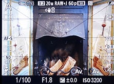 If you’re composing with the screen, the RX100 III offers up to six views, again depending on which you have selected in the menus: one with lots of shooting information and the shutter and aperture indicated on scales superimposed on the image, one with detailed shooting information superimposed over all four sides of the image, another view that’s clean, a fourth with a live histogram, a fifth with a dual axis leveling gauge, and a sixth which dispenses with the live image and swaps it for a screen filled with detailed shooting information along with a dual-axis leveling gauge and a very large live histogram. Like the viewfinder you can also superimpose a choice of alignment grids over all the display views, apart from of course the full-screen information option.