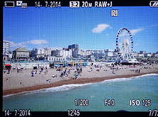 During playback you can cycle between a clean view, one with shooting information and a third page which displays a thumbnail with flashing highlights and shadows, surrounded by more detailed shooting details and RGB plus brightness histograms; if your photo is in the portrait orientation, it’ll automatically fill the screen if the camera is turned on its side during playback, so long as rotation is set to auto in the playback menus.