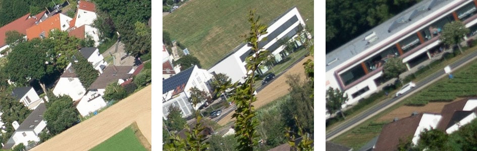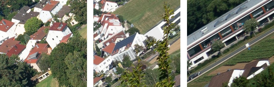 The Siemens-star test-targets are shot at a distance of 45x focal length (i.e. at around 1.2m for 28mm focal length). But performance of lenses also depends on the shooting distance. Therefore I present another series of test-shots of a city around 1 km away. Processing was done in Lightroom 8/CRAW 11 from RAW to Adobe Color profile with the lens-profile automatically applied (except for distortion compensation). Noise-reduction is set to 0, sharpening to 50/0.5/36/10, with no extra tone, color, or saturation adjustment. I used autofocus at the largest aperture and did not change focus for other apertures. All shots were made at ISO 100 and image stabilization switched off.