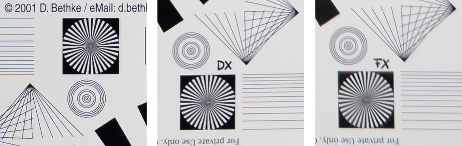 Above: Tamron 17-28mm f2.8 Di III at 24mm, f5.6; 100% crop from center, APS-C-corner, FF-corner
