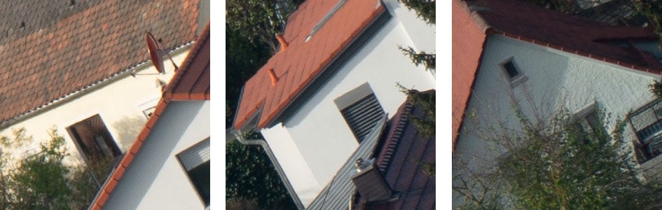 The Siemens-star test-targets are shot at a distance of 45x focal length (i.e., at around 18m for 400mm focal length). But performance of lenses also depends on the shooting distance. Therefore, I present another series of images shot on a 42MP Sony A7R II of a city around 1 km away. Processing was done in Lightroom 12.0/CRAW 15.0 from RAW to Adobe Color profile with Adobe’s lens profile compensating distortions but not vignetting. Noise-reduction is set to 0, sharpening to 50/0.5/36/10, with no extra tone, color, or saturation adjustment. All shots were made from a heavy tripod with image stabilization switched off. As usual I have selected the diagonal that provided the better corner results.