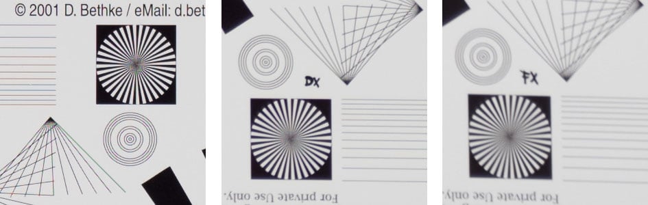 In the center the Nikon is a bit softer than the Tamron, the DX-corner is on a par, and in the FX-corner the Tamron again has a slight lead. It’s also obvious that the Tamron produces less distortions in the DX-corner and FX-corner than the Nikon.