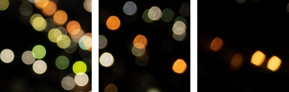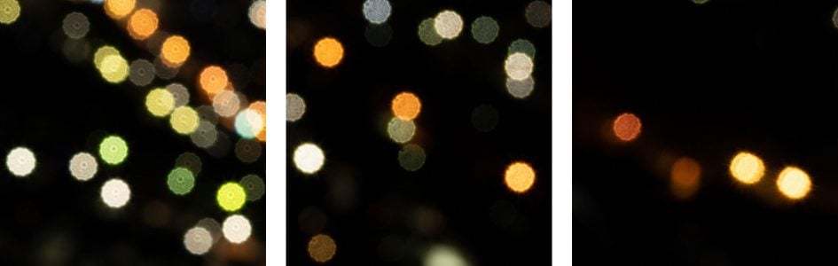 This test is for the rendering of point-light sources in an out-of-focus background. The circle of confusion that is produced by this test is pretty indicative of Bokeh performance (in the background) and light fall-off. Ideally the out-of-focus image of the point-light is evenly lit and perfectly circular, with no “onion-rings”, and without coloration. Large aperture lenses normally produce an effect known as “cat’s eye” the further away from the optical axis the point-light is projected. This is due to optical vignetting in the lens barrel when light enters the lens from an angle.