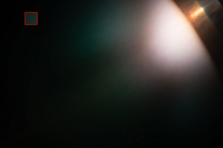 Catching a strong light-source shining directly into the lens is always a risky business: it could produce strange colorful ghost-images or reduce contrast considerably through flare and glare. The appearance of flare and ghosting depends on factors like the aperture and the angle of the light hitting the lens. So to judge the proclivity of the Mitakon 50mm f0.95 III for these artifacts I went through a series of well calculated shots against a strong light source to provoke glare and ghosting. The lens hood was mounted in all shots. Following is one of the more extreme example results. The little bright square inset in the upper left shows the respective area with an exposure compensation of +3 EV to make it easier to see which levels of black the lens renders at that point: